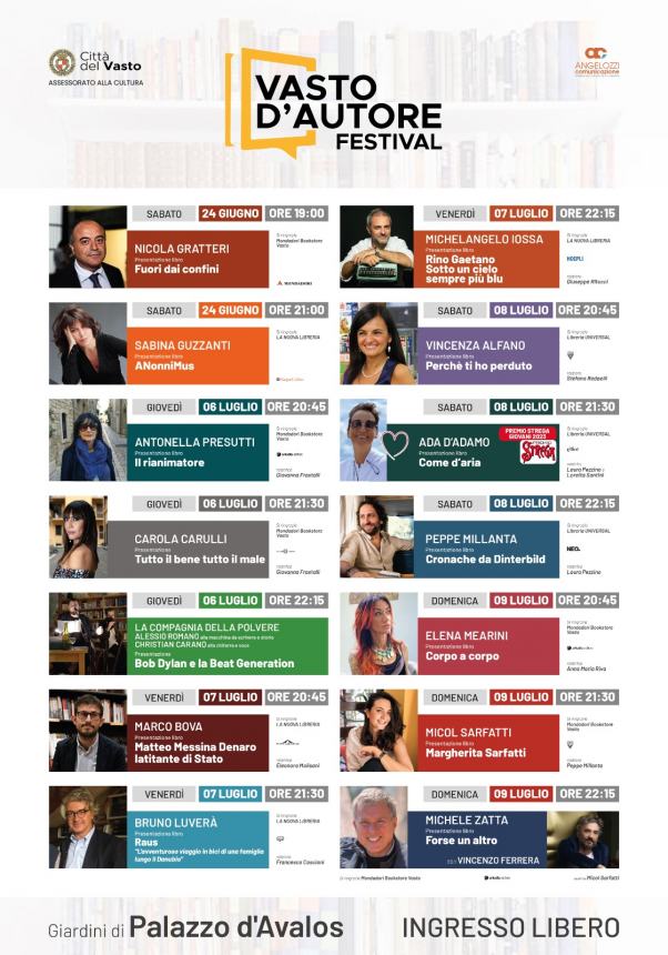 Dal 6 al 9 luglio Vasto la seconda edizione del Festival Vasto d’Autore con un programma ricco di nomi di rilievo del mondo della cultura, del giornalismo d’inchiesta e della narrazione. Presenti nomi illustri dell’editoria nazionale in veste di relatori. Quindici autori, tre per ogni sera a dialogare con i relatori e il pubblico in una formula coinvolgente. Ogni serata vedrà la conclusione in una breve performance musicale.