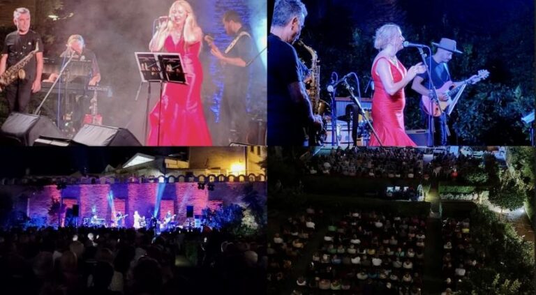 Parole parole, Se telefonando, queste sono solo alcune delle canzoni che Fernanda D’Ercole ha intonato sul palco insieme ai suoi musicisti nella splendida cornice dei giardini.