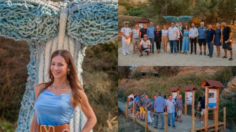 VASTO. Quattro bacheche illustrative, uno scheletro in spiaggia per futuri progetti educativi e una coda di capodoglio in immersione dal colore azzurro mare. Quest’ultima opera, “Tuffo”, è stata realizzata dall’artista abruzzese Emanuela Giacco con funi nautiche di riciclo. Questi gli ingredienti principali del museo diffuso a cielo aperto, finanziato dalla regione con 70mila euro, che è stato collocato nella porzione di spiaggia antistante l’attuale casotto informativo di Punta Penna, adibito a centro visite. I lavori si sono conclusi in concomitanza del nono anniversario da quel drammatico 12 settembre 2014 quando Punta Penna è stata teatro di un evento che scosse l’intera comunità e che non è stato più dimenticato.