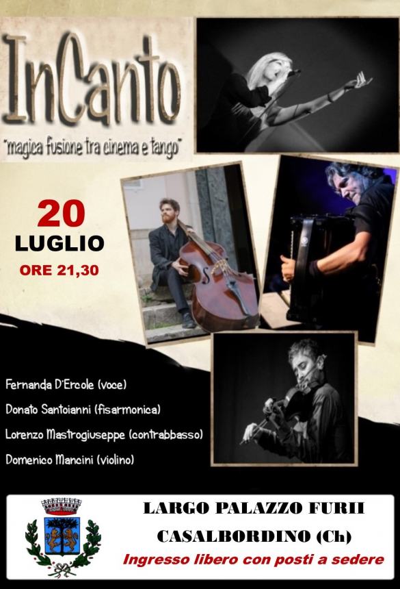 CASALBORDINO. “Largo Palazzo Teresa Furii ospiterà questa sera alle ore 21:30 uno spettacolo unico nel suo genere in una fusione magica tra cinema e tango, con la voce talentuosa e vellutata di Fernanda D’Ercole, accompagnata da Donato Santoianni alla fisarmonica, Lorenzo Mastrogiuseppe al contrabbaso e Domenico Mancini al violino.