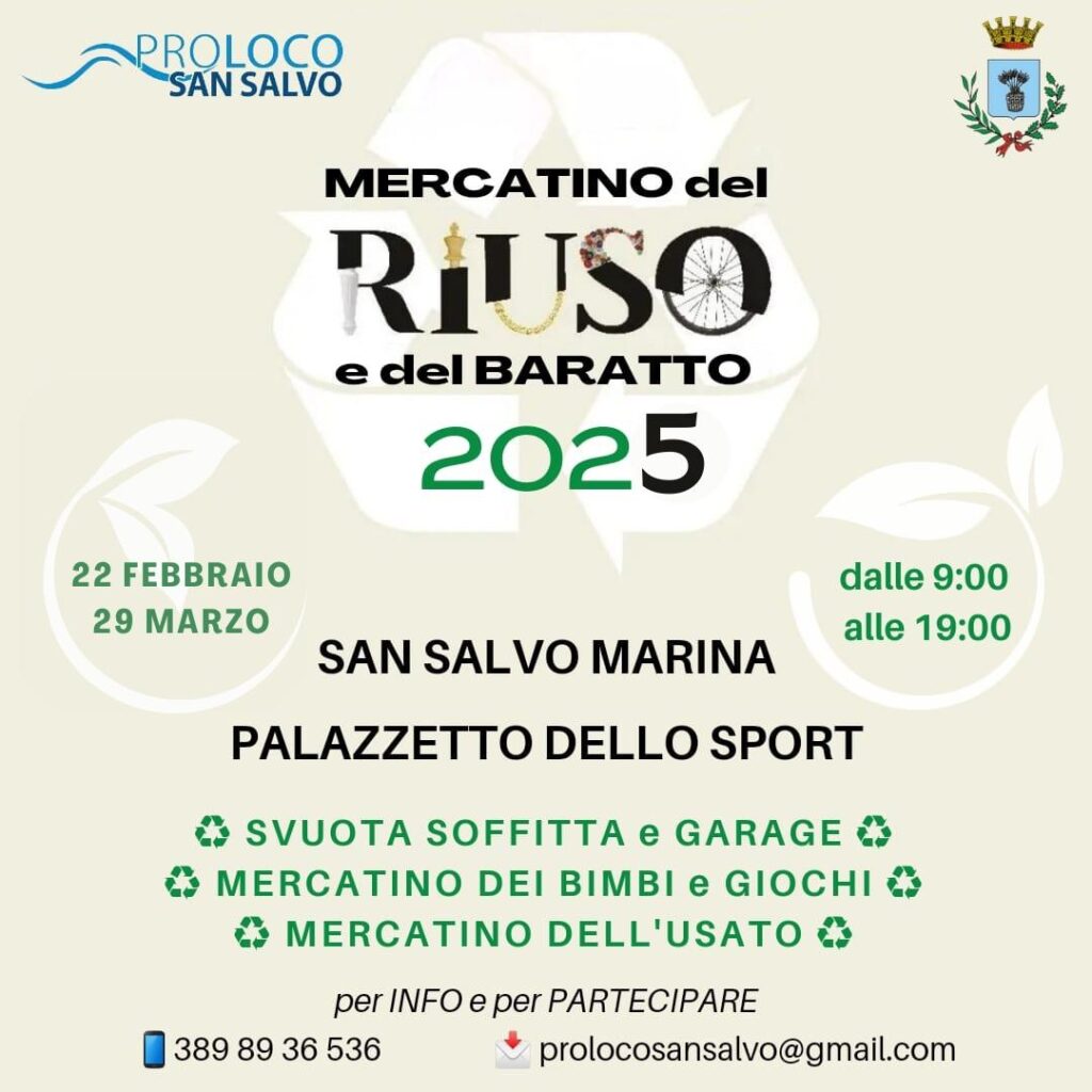 SAN SALVO. “La Pro Loco San Salvo invita la cittadinanza a recarsi domani, sabato 22 febbraio, presso il palazzetto dello Sport di San Salvo Marina per visitare il mercatino del Riuso per cercare oggetti che possano essere ancora utili per loro