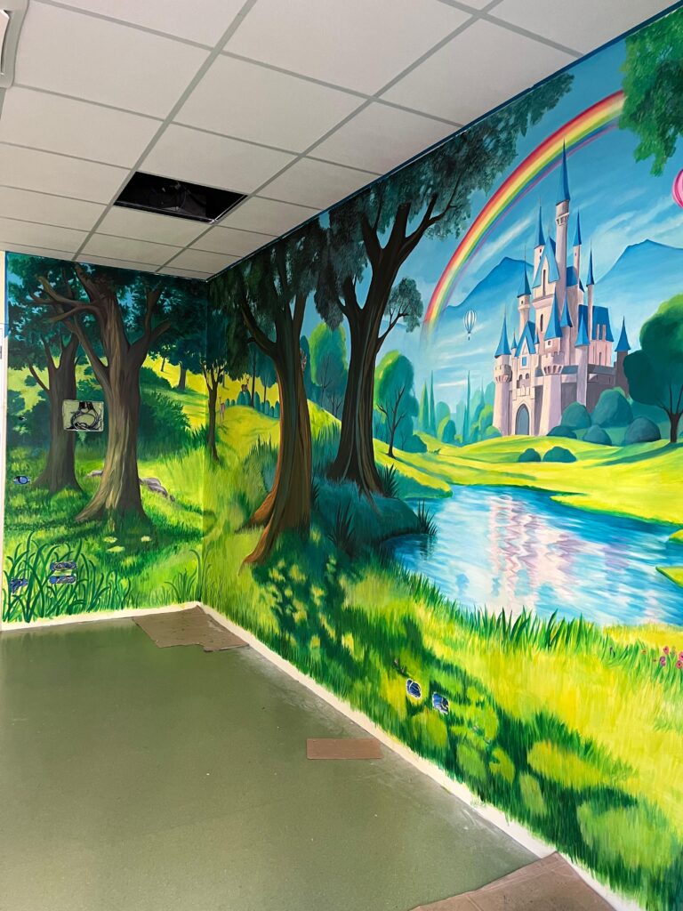 Nell’ambito del progetto “Ospedali dipinti”, la stanza è stata inoltre decorata con un murales realizzato da CMK Lab, ideato al fine di rendere l’ambiente più sereno e capace di trasmettere accoglienza e positività ai piccoli pazienti che accedono all’ambulatorio, che vede come referente la Dr.ssa Sara Matricardi e il Servizio Regionale di Neurologia Pediatrica, il cui riferimento è il Dr. Giovanni Prezioso.