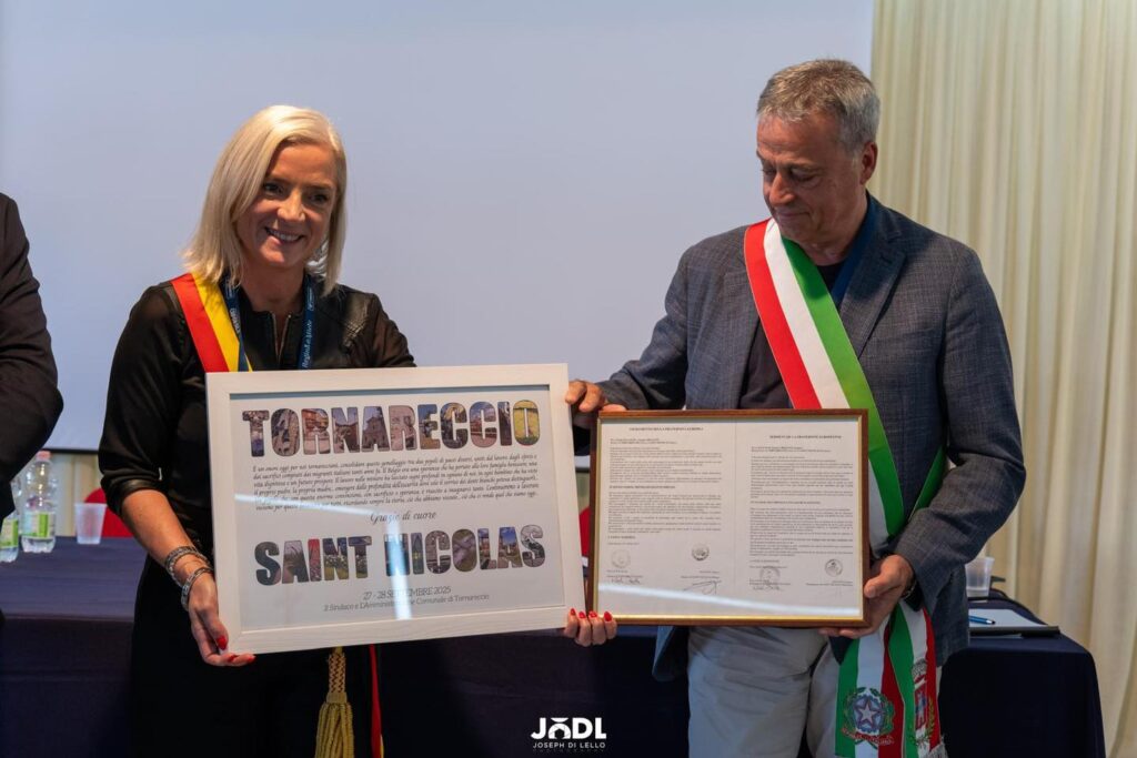 Ospite dell’edizione 2025 di Tornareccio Regina di Miele la delegazione del comune belga di Saint-Nicolas, accolta da numerosi tornarecciani con grande partecipazione ed emozione, dal sindaco Iannone e la sua amministrazione comunale e da Nicola Pallante che sottoscrisse, da primo cittadino, il patto di fratellanza tra i due comuni, nato per rendere viva la memoria di moltissimi tornarecciani impiegati nella miniera e nelle aziende della città del Belgio. “É un vero piacere essere qui alla festa del miele – ha commentato la sindaca di Saint-Nicolas Valerie Maes -. La vera regina del miele è Tornareccio, una scoperta incredibile con degli apicoltori fantastici e l’arte della tradizione dell’artigianato che è veramente formidabile. Il gemellaggio tra Tornareccio e Saint-Nicolas è una parte di storia che condividiamo insieme, oggi rendiamo onore a tutte quelle persone che da questo paese sono venute nella nostra terra a lavorare, attraverso la scoperta della loro storia e della loro cultura”.