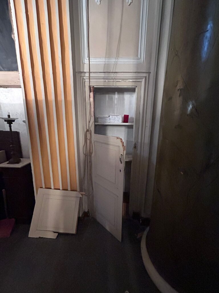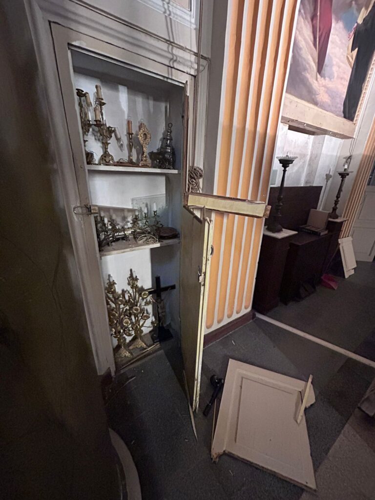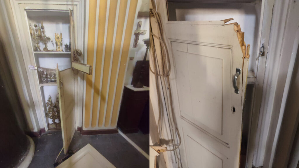 Ad accorgersi di quanto era accaduto è state un residente che ha immediatamente avvertito i custodi. La porta, infatti, era semi rotta con una evidente impronta di un piede all’altezza della serratura a testimoniare che i malviventi l’avevano molto probabilmente presa a calci. Per terra è stata ritrovata anche una pompa con bussola usata per sfondare i pannelli di legno.