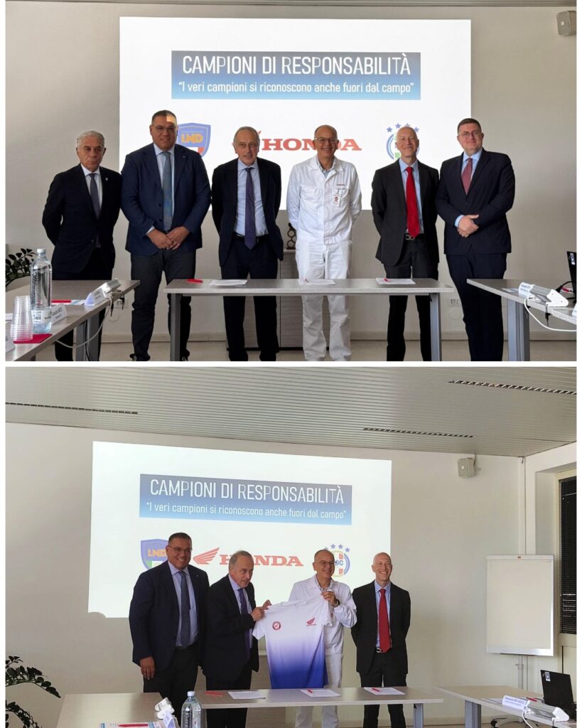 ATESSA. Motori e calcio, due passioni italiane, si intrecciano in un progetto innovativo che unisce sport ed educazione civica. La Lega Nazionale Dilettanti, Honda Italia Industriale e Honda Motor Europe Ltd – Italia hanno firmato ieri, nello stabilimento Honda in Val di Sangro, il protocollo d’intesa per il progetto Campioni di responsabilità, rivolto ai ragazzi tra i 10 e i 16 anni tesserati per le società affiliate alla LND.