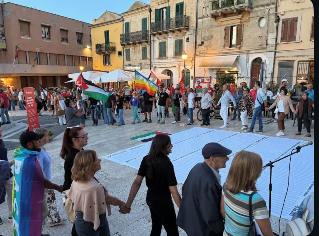 È seguito un minuto di silenzio, la proiezione di video che raccontano il genocidio in Palestina e la formazione di una catena umana a cerchio, mentre le voci di tutti si univano nello slogan corale: Palestina Libero, e che lo sia veramente!