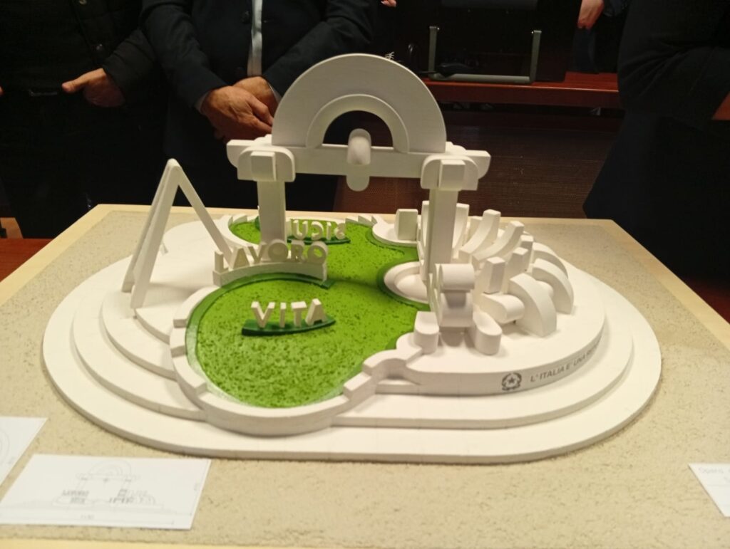 L’opera, ideata dall’artista Raffaele Mucilli, sarà realizzata in marmo di Carrara e caratterizzata da simboli legati all’agricoltura, all’industria e alla natura. Tre parole ne guideranno il senso: “Lavoro, Vita, Sicurezza”.