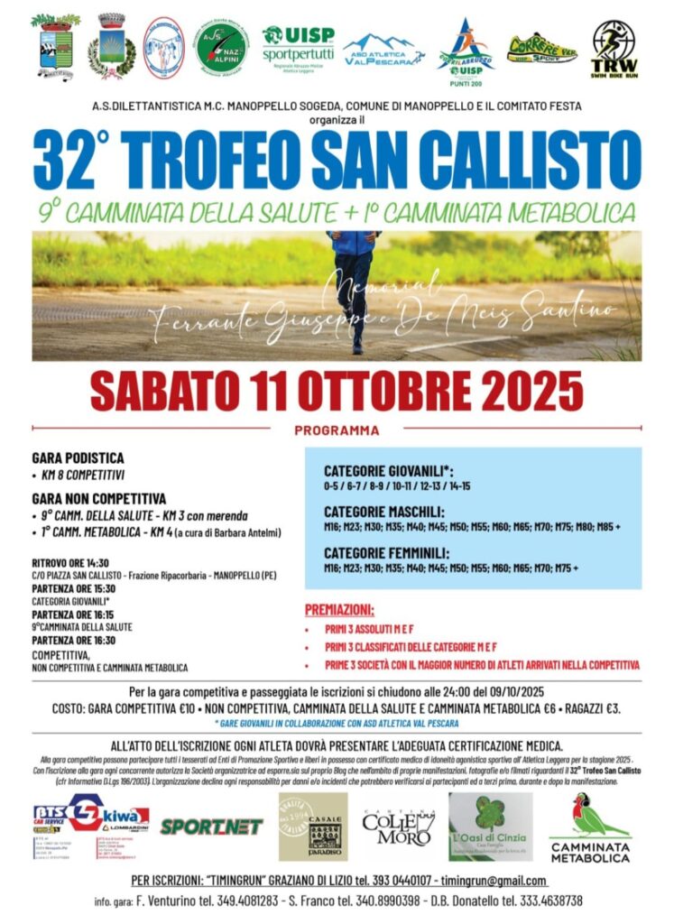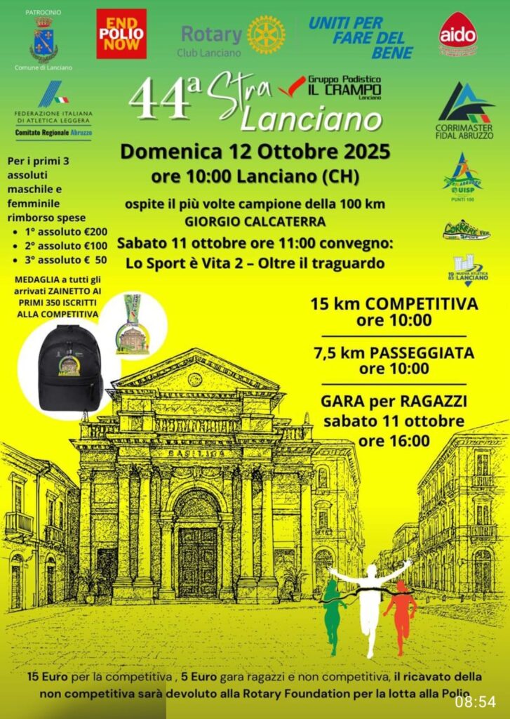 Organizzata dal Gruppo Podistico Il Crampo con il patrocinio del Comune, la manifestazione si conferma tappa fondamentale del circuito Corrilabruzzo UISP, accendendo i motori delle ultime, decisive fasi della stagione podistica. Da segnalare il coinvolgimento del Rotary Club Lanciano che sarà partner della manifestazione. Il clou di tutta la mattinata di domenica 12 ottobre nella città frentana è rappresentato dalla gara competitiva di 15 chilometri con partenza alle 10:00 da piazza Plebiscito che abbraccia l’intero centro cittadino e interessa anche il Parco Villa delle Rose. A fianco la passeggiata non competitiva di 7,5 chilometri di rilevante importanza in seno al Rotary Club Lanciano: il ricavato delle iscrizioni andrà a sostegno della campagna di eradicazione della poliomielite.