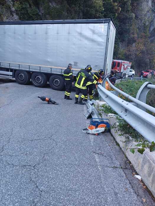 Necessario l’intervento dei carabinieri e dei vigili del fuoco, che hanno tagliato parte del guardrail per disincastrare il mezzo e consentire all’autista, con manovre lente e precise, di liberare progressivamente la strada.