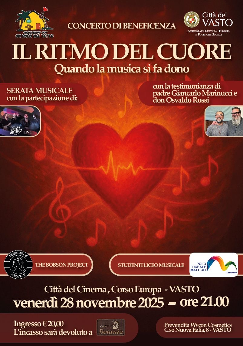 VASTO. Venerdì 28 Novembre 2025 alle ore 21,00 presso Città del Cinema (ex Multisala del Corso), sita in Corso Europa a Vasto, si terrà un concerto di beneficenza intitolato “Il Ritmo Del Cuore. Quando la musica si fa dono”. L’evento, organizzato dall’associazione di volontariato Un buco nel tetto con il Patrocinio del Comune di Vasto (Assessorati alla Cultura, Turismo e Politiche Sociali), ha come obiettivo quello di raccogliere fondi per Casa Betania, una casa di accoglienza sita in San Giovanni Lipioni (CH) fondata da Padre Giancarlo Marinucci e Don Osvaldo Rossi. Entrambi i sacerdoti, molto amati  in città, saranno presenti la sera dell’evento e parleranno alla platea del progetto di questa struttura già esistente che necessita di ampliamenti.