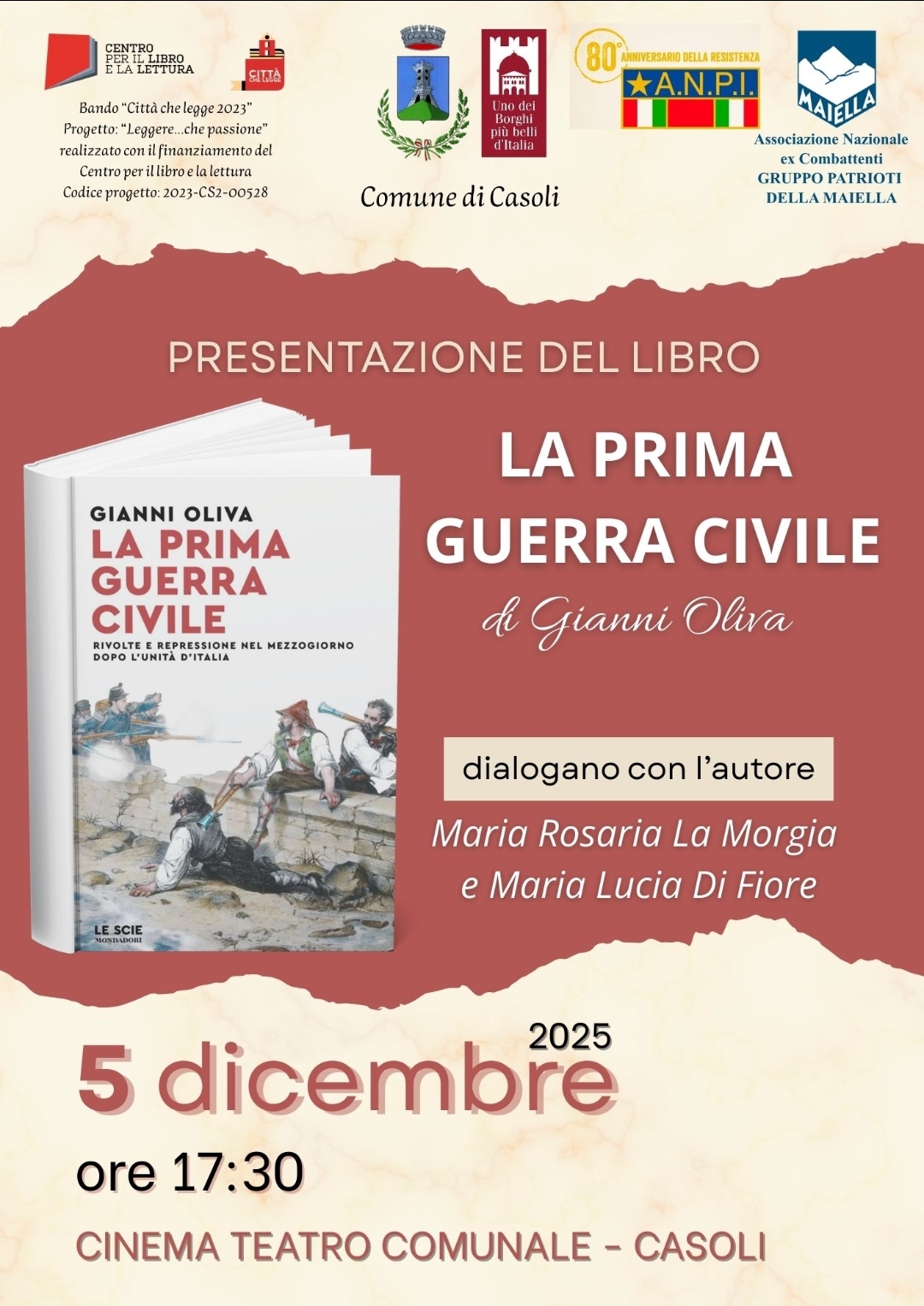 CASOLI. Venerdì 5 dicembre, alle 17:30, al Cinema Teatro Comunale di Casoli si terrà la presentazione del libro dello storico e giornalista Gianni Oliva dal titolo “La prima guerra civile“.