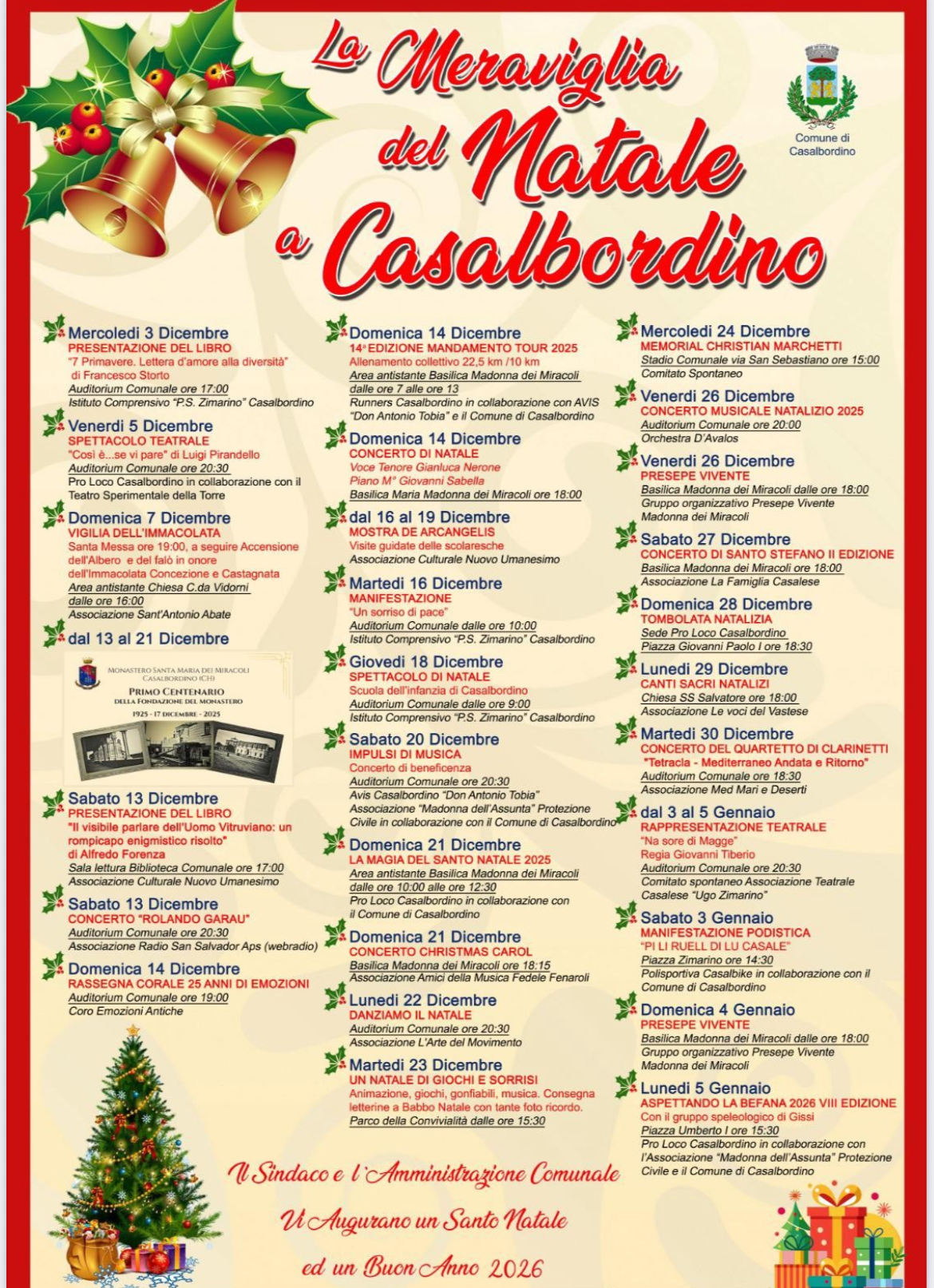 CASALBORDINO. L’Assessore al turismo del Comune di Casalbordino Paola Basile ha pubblicato il programma “La Meraviglia del Natale a Casalbordino”, un cartellone di iniziative promosse dall’Amministrazione e realizzate in occasione delle festività 2025.