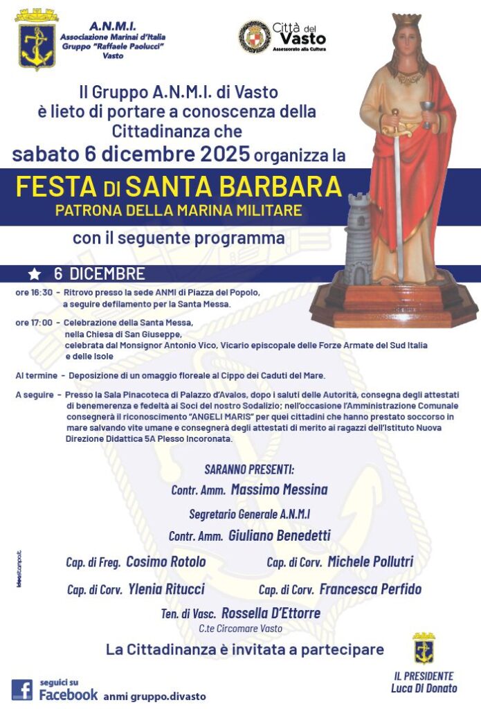 VASTO. L’Anmi di Vasto è pronta per festeggiare Santa Barbara, patrona della Marina Militare.