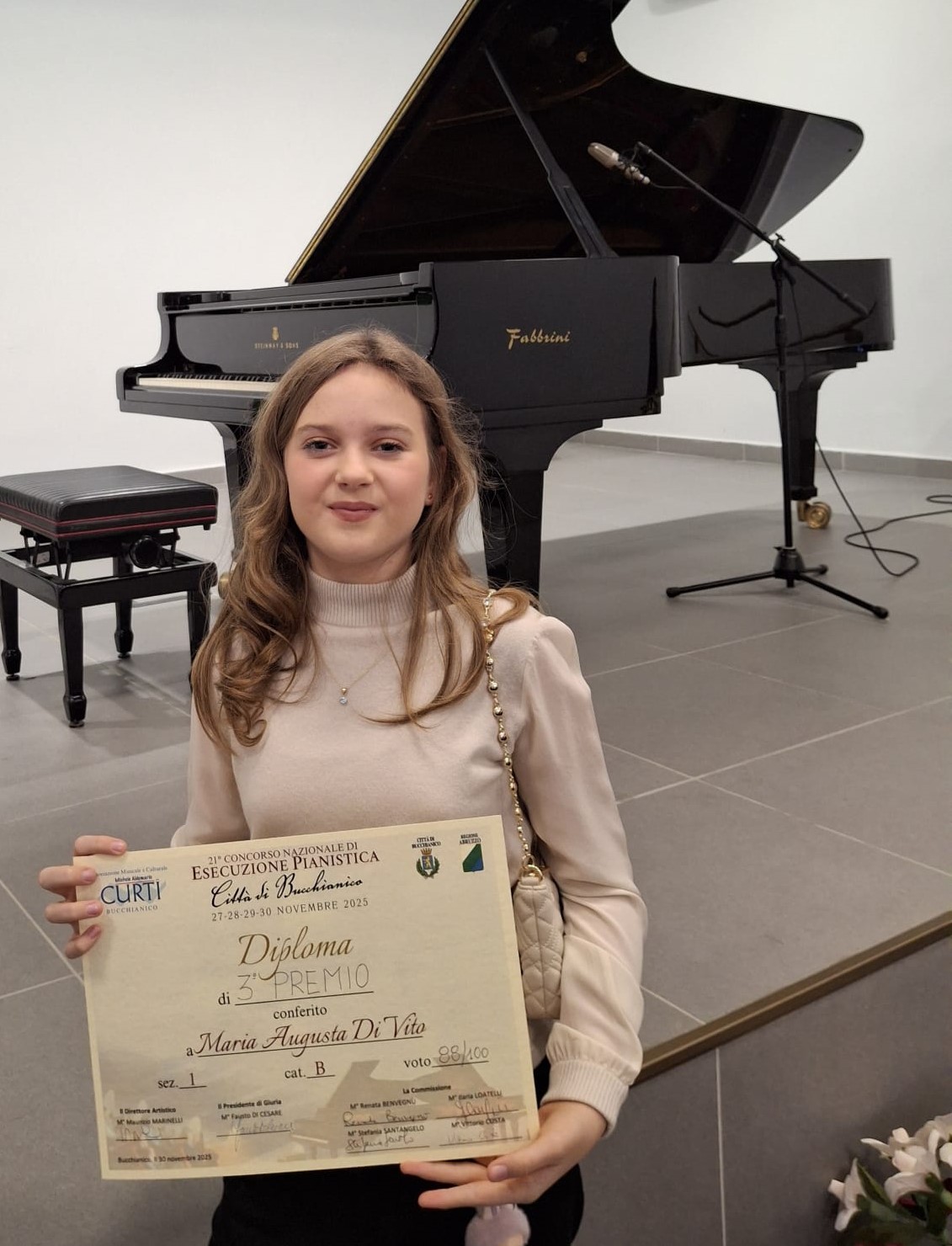 VASTO. Al 21° Concorso Nazionale di Esecuzione Pianista “Città di Bucchianico”, tenutosi dal 27 al 30 novembre, Emanuele Santoro e Maria Augusta Di Vito, allievi della Scuola Civica Musicale Città del Vasto, nella classe di pianoforte del M° Michele Taraborrelli, si sono distinti ottenendo il Terzo Premio; il primo nella categoria F (19-23 anni) e la seconda nella categoria B (11-13 anni).
