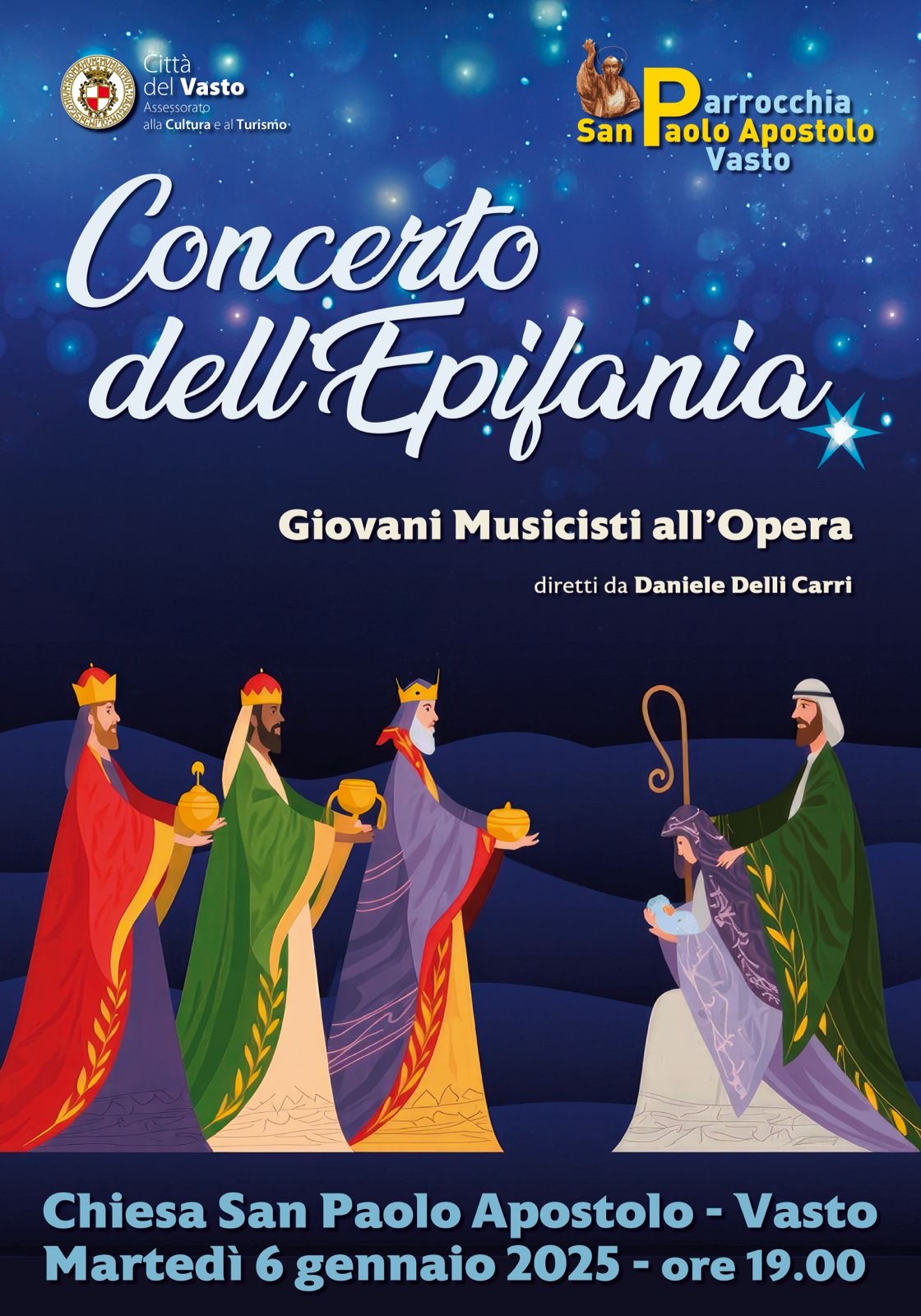 VASTO. Martedì 6 gennaio 2026 alle ore 19.00 la chiesa di San Paolo Apostolo ospita il concerto dell’Epifania, con giovani musicisti all’opera, diretti dal maestro Daniele Delli Carri. L’evento è patrocinato dall’assessorato alla Cultura e al Turismo.